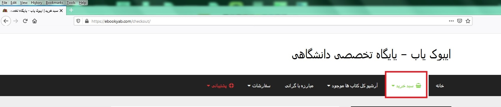 ۵ – برای نمایش بهتر “سبد خرید” میتوانید از منوی بالا روی “سبد خرید” کلیک نمایید (با مستطیل قرمز نشان داده شده است).