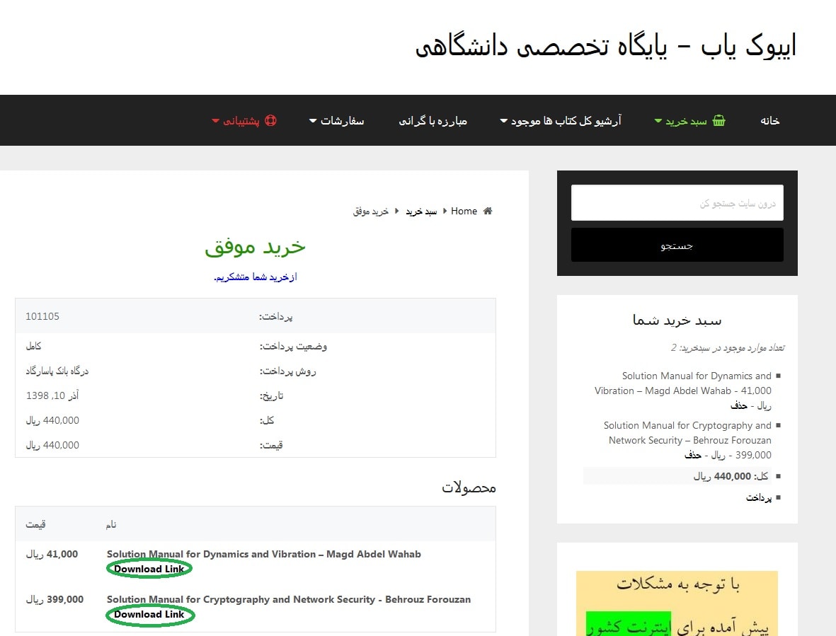 پس از پرداخت موفق، از صفحه بانک به صفحه زیر ارجاع داده خواهید شد که مشخصات پرداختی تان به همراه لینک دانلود را نشان می دهد. با کلیک روی لینک های دانلود (که درون کادر سبز نشان داده شده اند)، بارگذاری و دانلود فایلهایتان آغاز می شوند.
